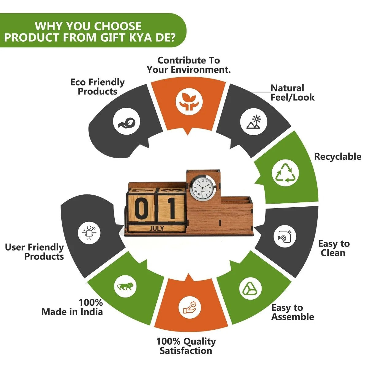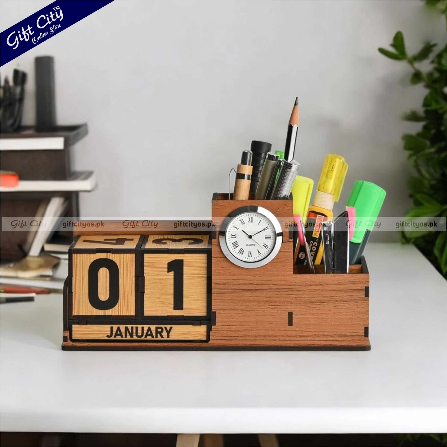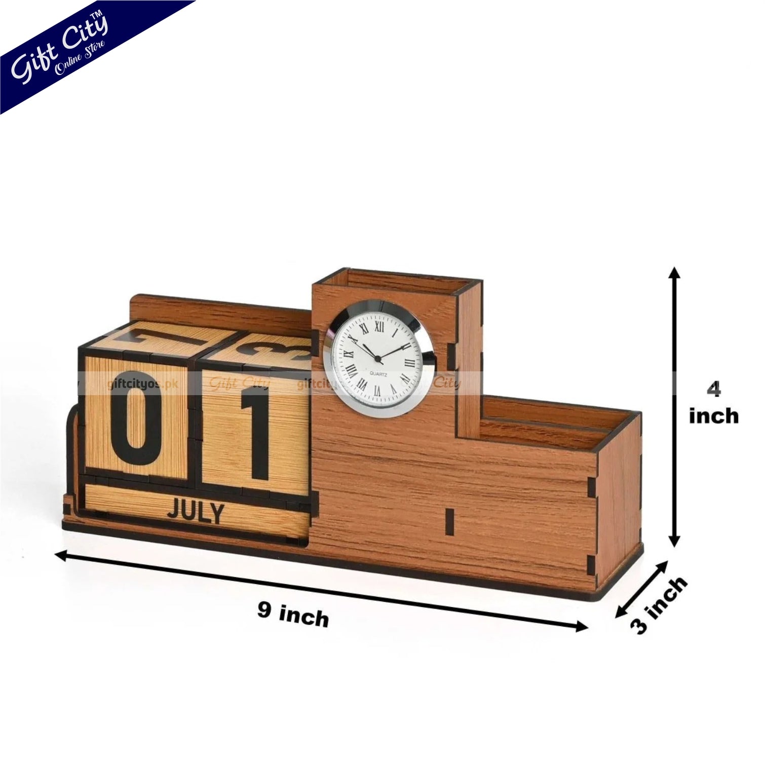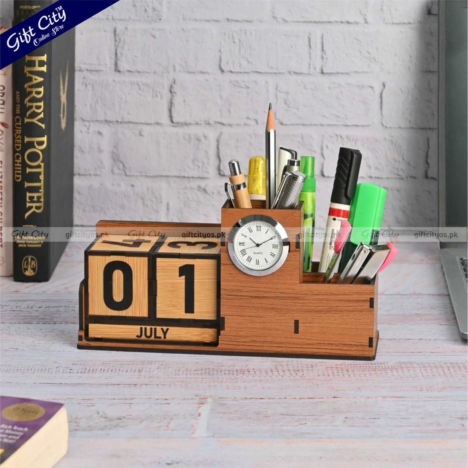 Featuring a lifetime Wooden Block Calendar, a Mini Analog Clock, and ample Storage Space for pens, markers, and office tools, this multifunctional piece brings harmony and class to any workspace. Its handcrafted wooden design adds a rustic yet modern aesthetic, making it a smart gift for professionals, corporate teams, or anyone who values a tidy desk.