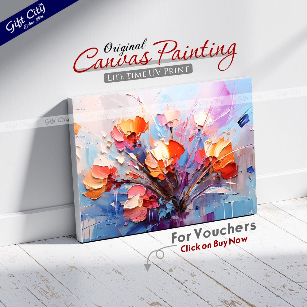 Gift City Presents Oil Painting Canvas - Modern Abstract Art - Vintage Floral Design with Golden Brushstrokes - Wooden Frame Wall Hanging