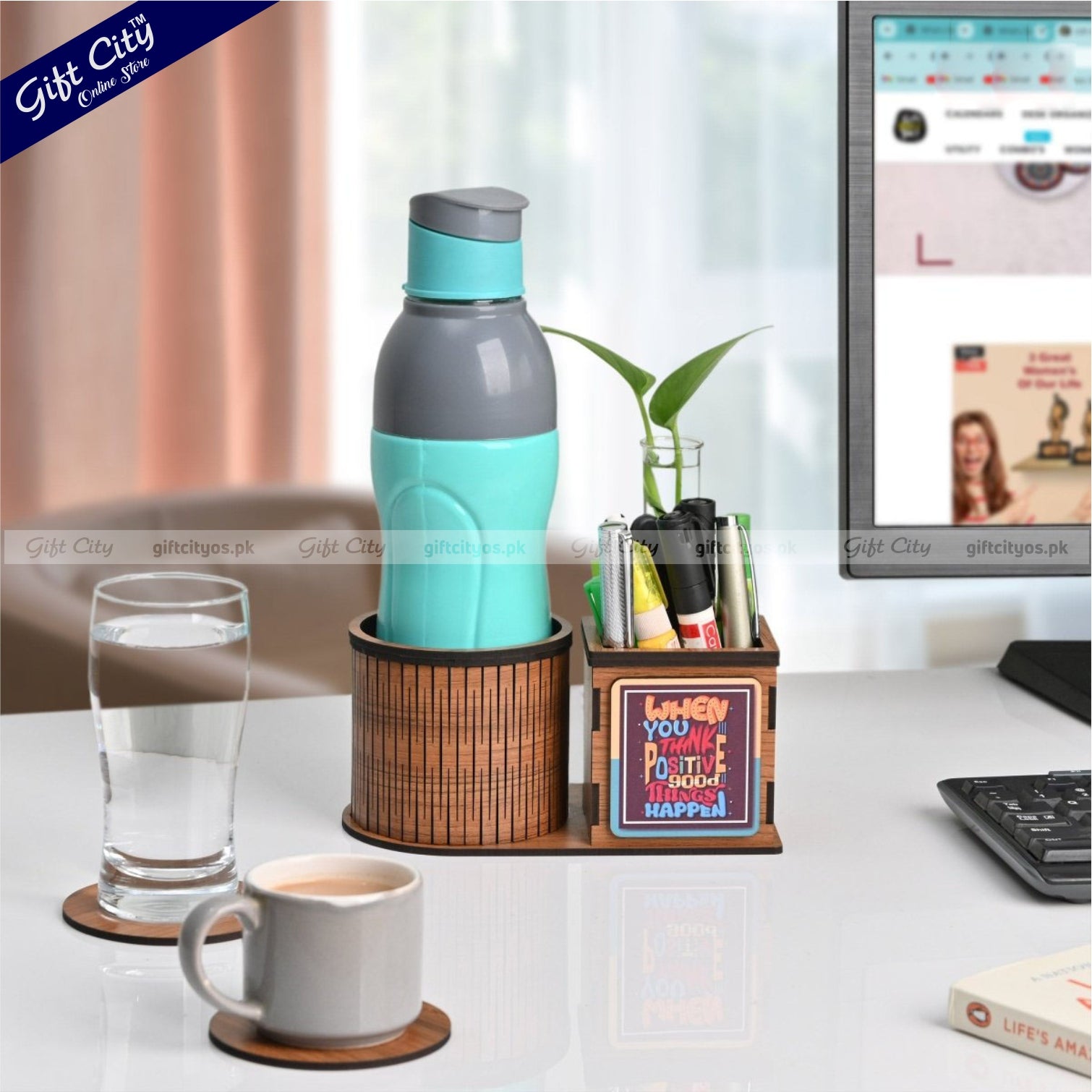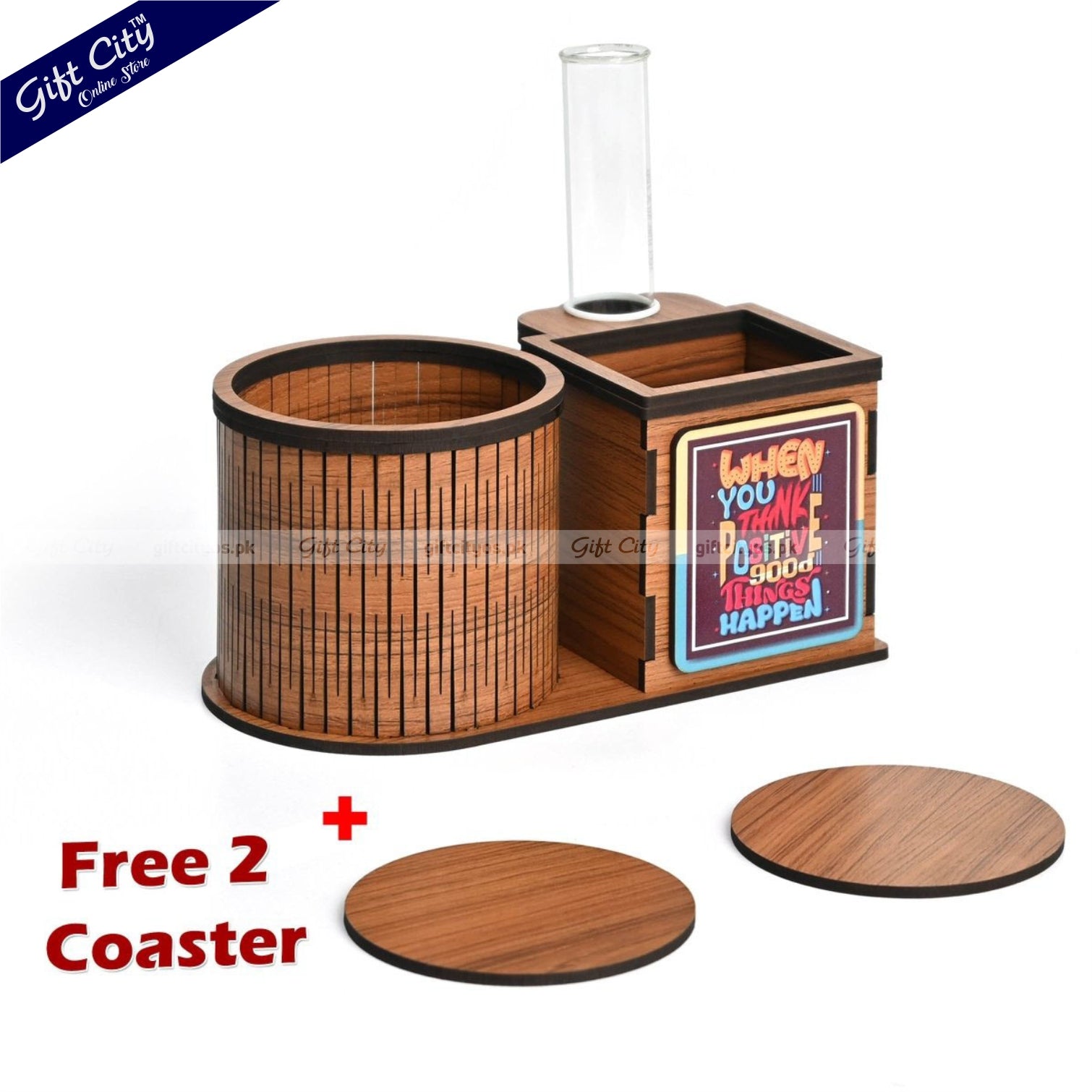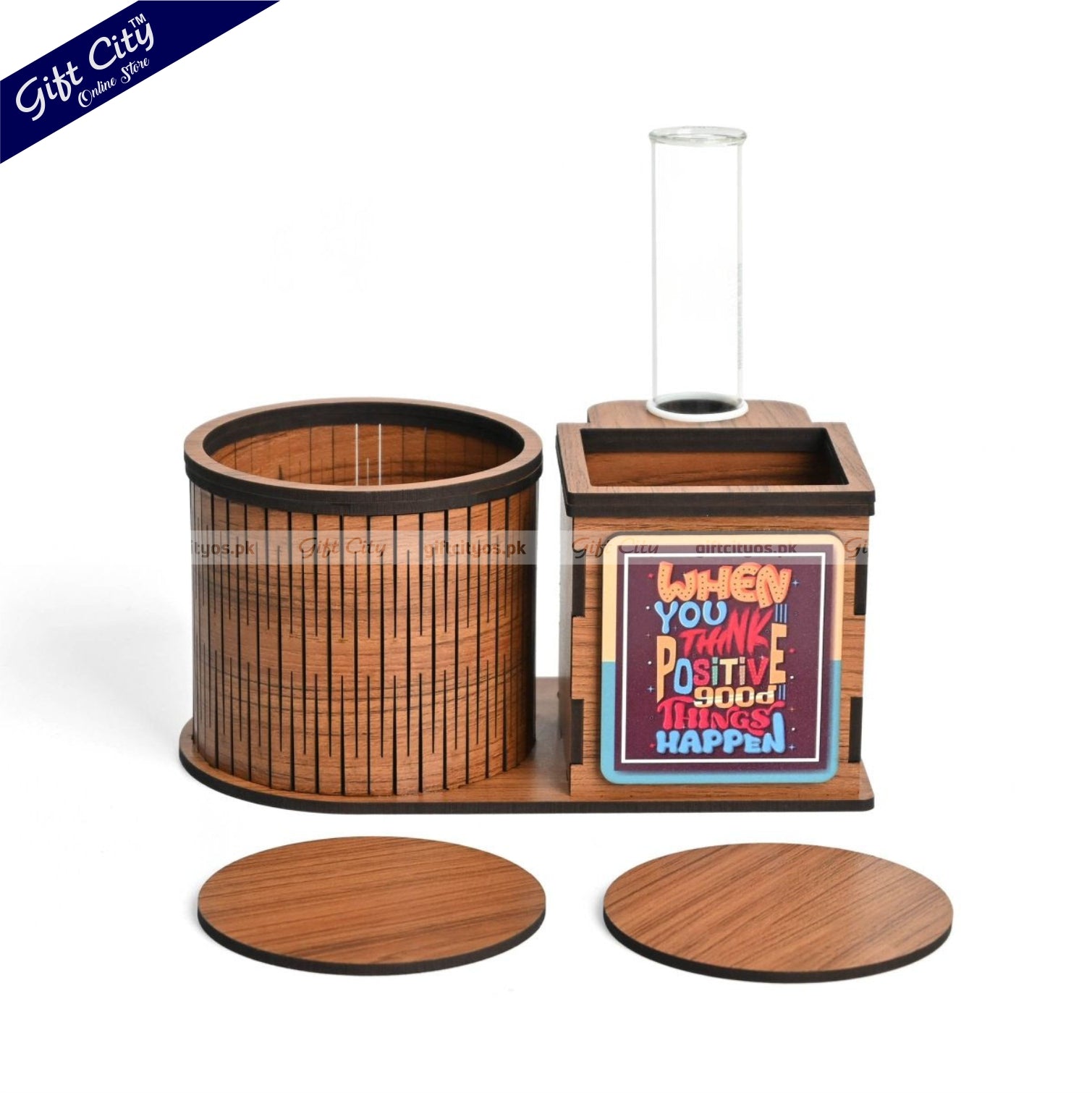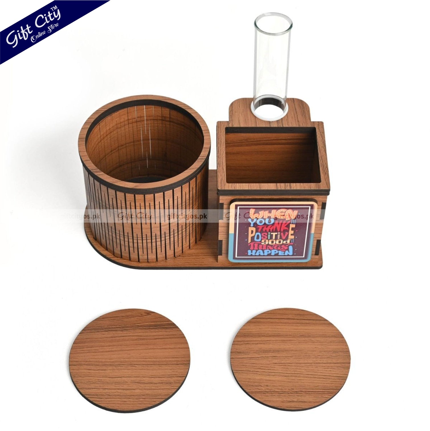 Upgrade your workspace with this sleek and Smart Multifunctional Wooden Desk Organizer, designed to keep your essentials neatly in place. With dedicated compartments for your Water bottle, Indoor Plant, Stationery, and Included Tea Coasters, this all-in-one organizer adds style and function to any desk.